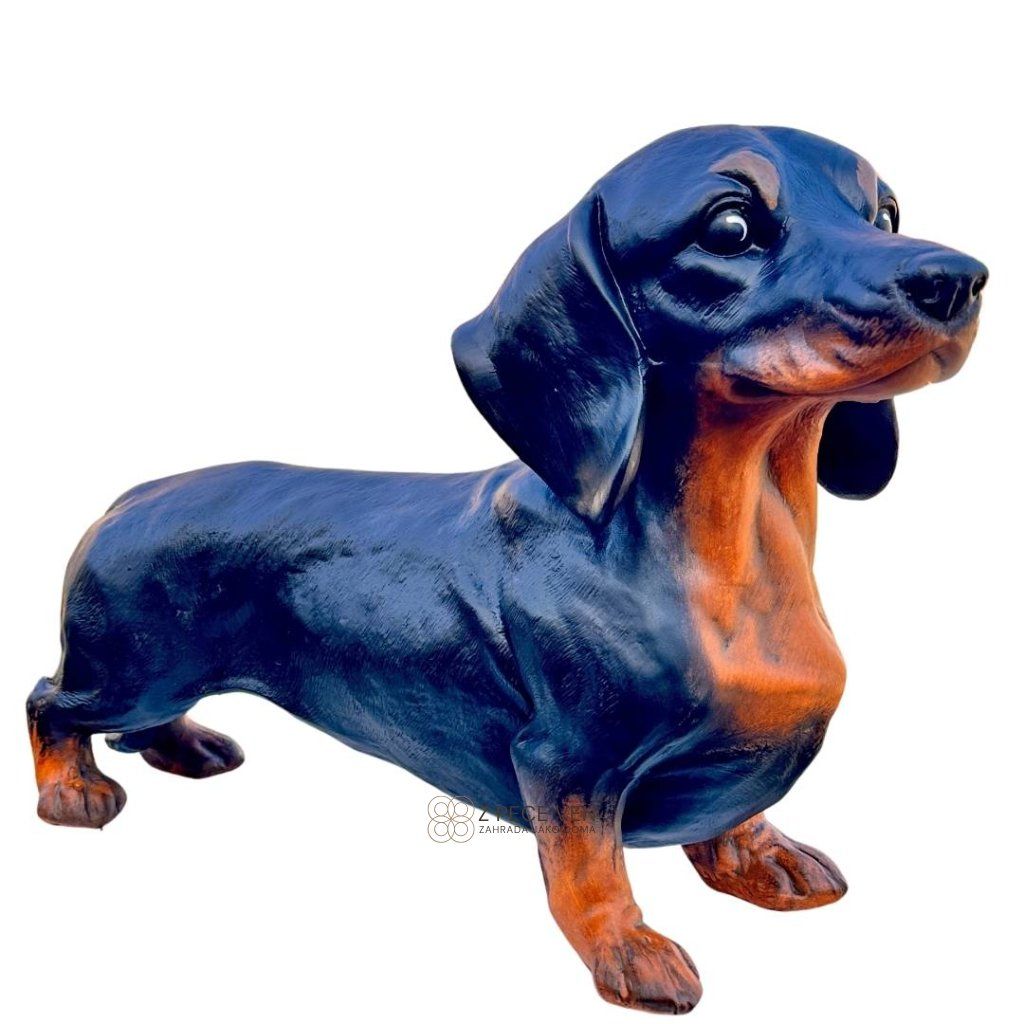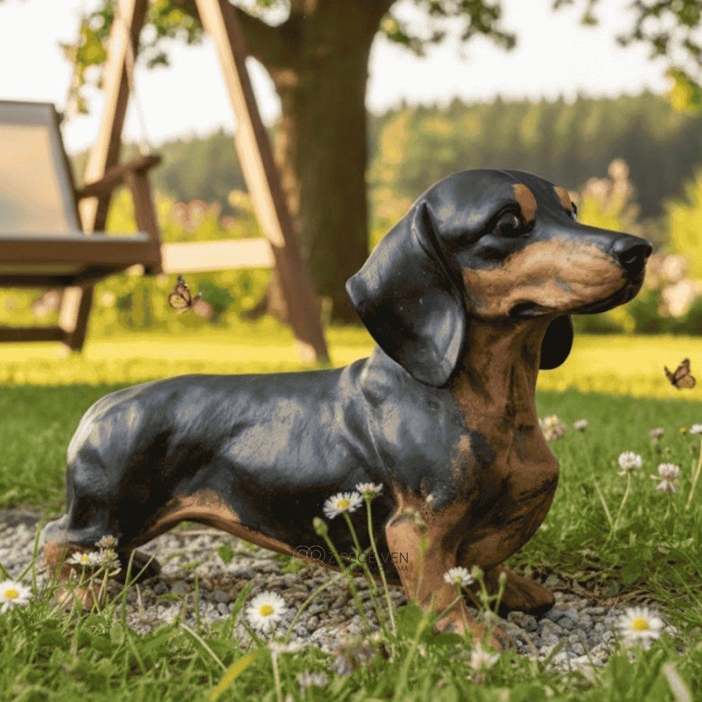 Keramický jezevčík působí jako skutečný společník, který v zahradě okamžitě přitáhne pozornost.