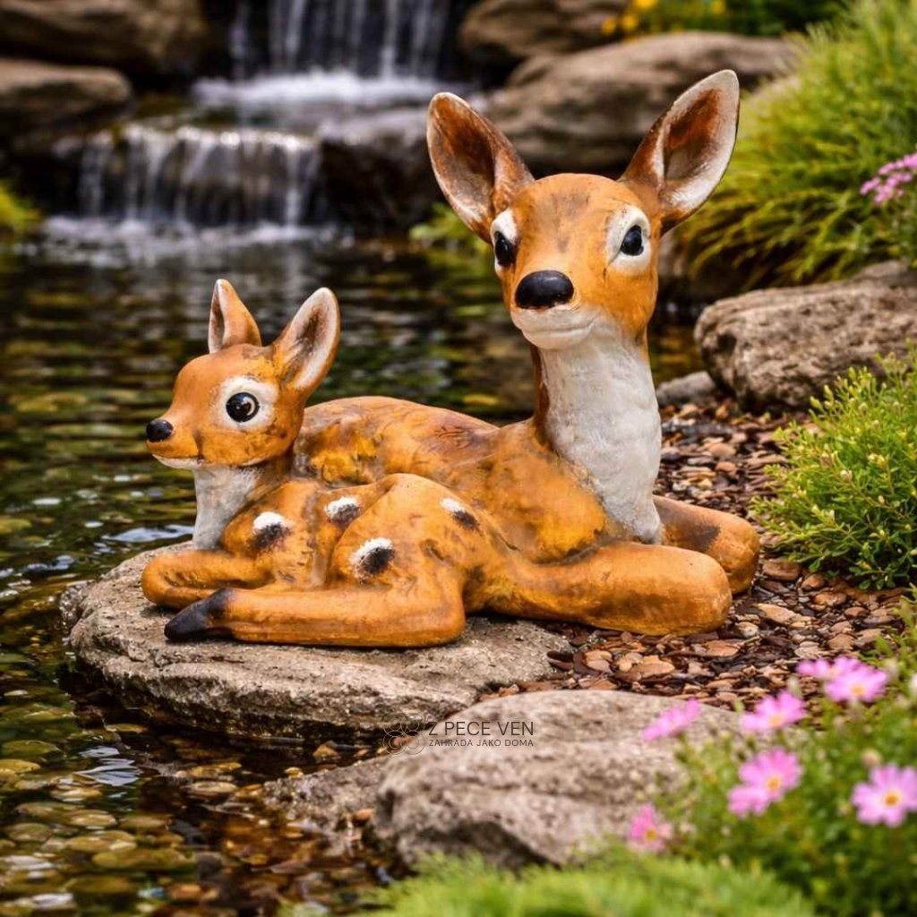 Oživte svou zahradu či terasu touto citlivě zpracovanou soškou srnky se srnčetem. Nové provedení v **hřejivých světle hnědých až rezavých tónech** skvěle doplňuje zelené plochy i dřevěné terasy. Detailní ruční malba na hrubé textuře věrně imituje přírodní povrchy a dodává figurce realistický vzhled, který do vašeho venkovního prostoru vnese klid a harmonii přírody. Každý kus je ručně malovaný originál, který v sobě nese duši poctivého českého řemesla.