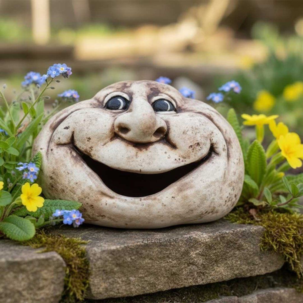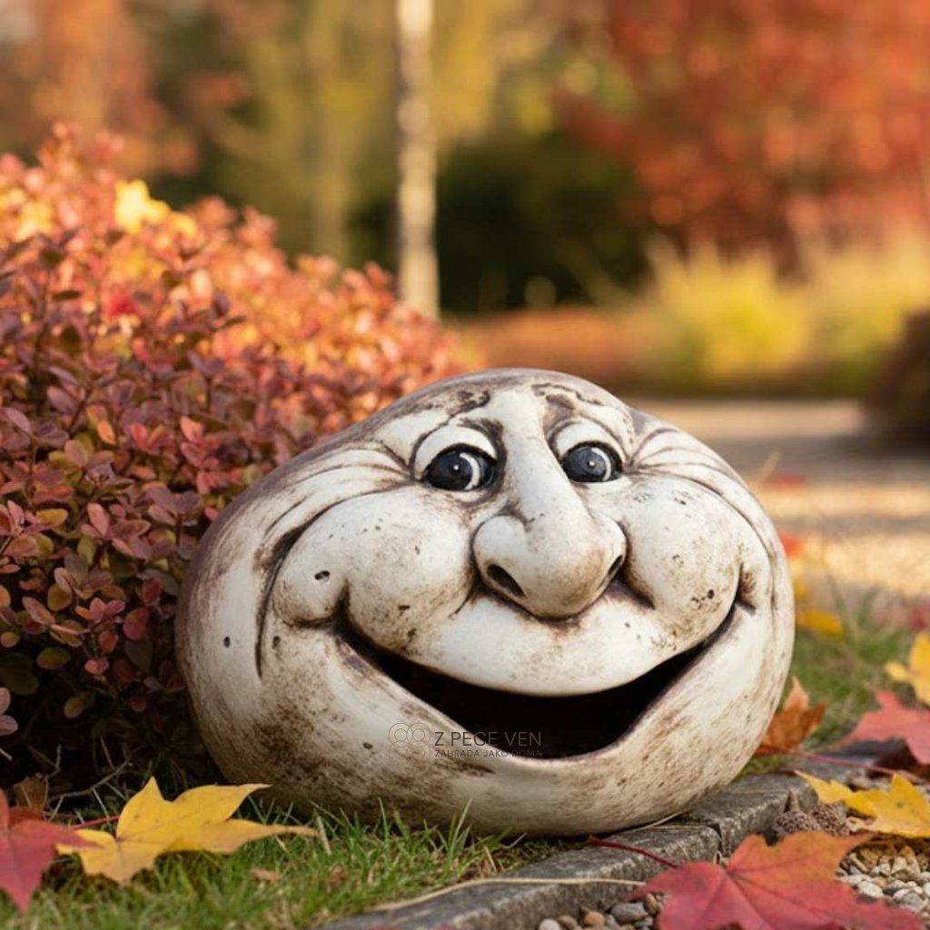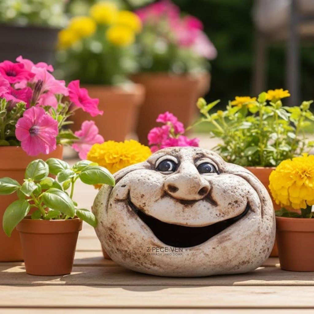 Keramická dekorace s širokým úsměvem okamžitě odlehčí záhon i skalku a přidá prostoru nadhled.