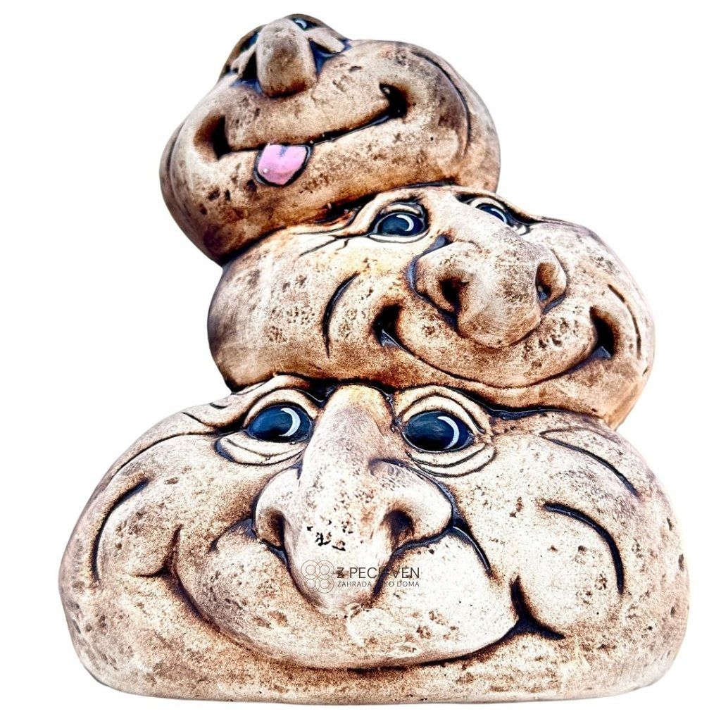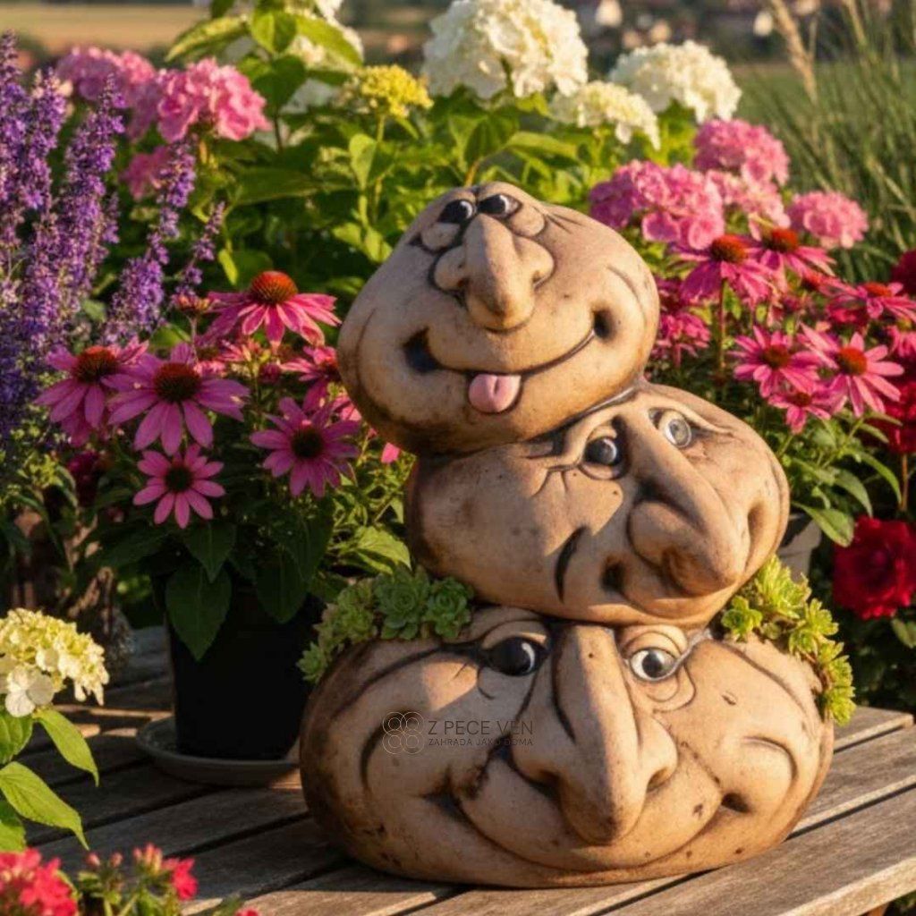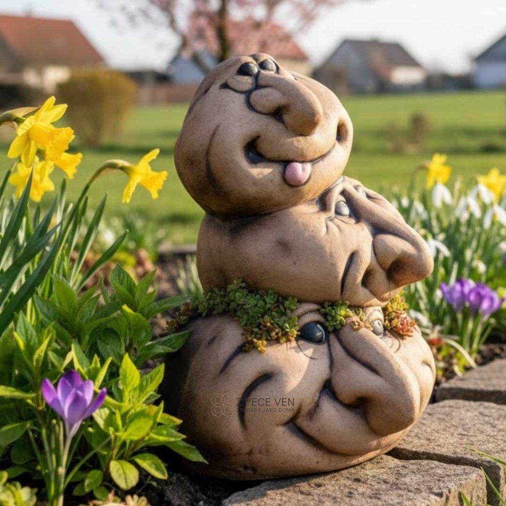 Kamenní chechtalové jsou navrženi jako stabilní dekorace, která díky své výšce 28 cm nezapadne ani v hustší výsadbě. Jejich nepravidelný tvar a zemité tóny patiny působí přirozeně, zatímco humorný podtón z nich dělá skvělý konverzační kousek pro každou návštěvu.