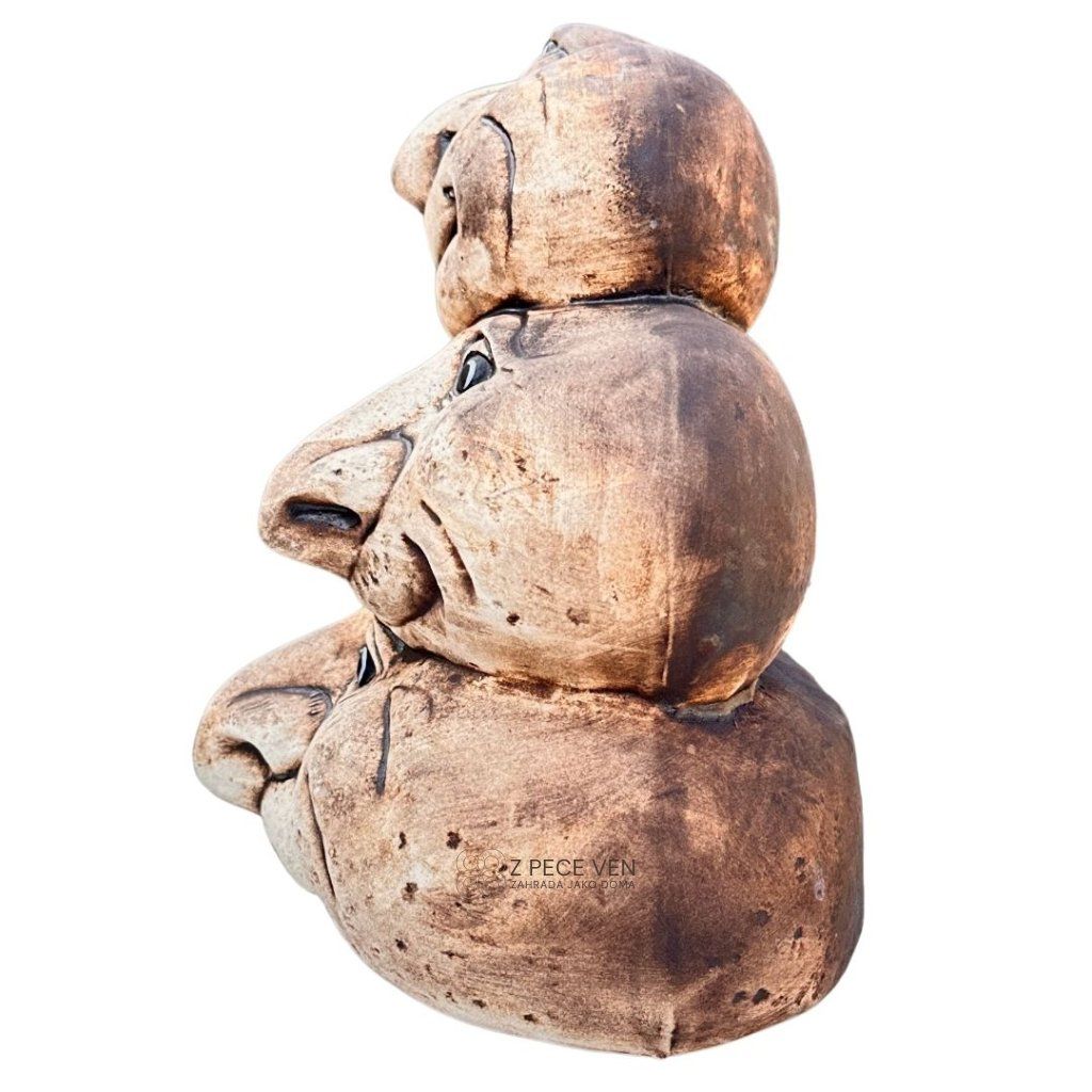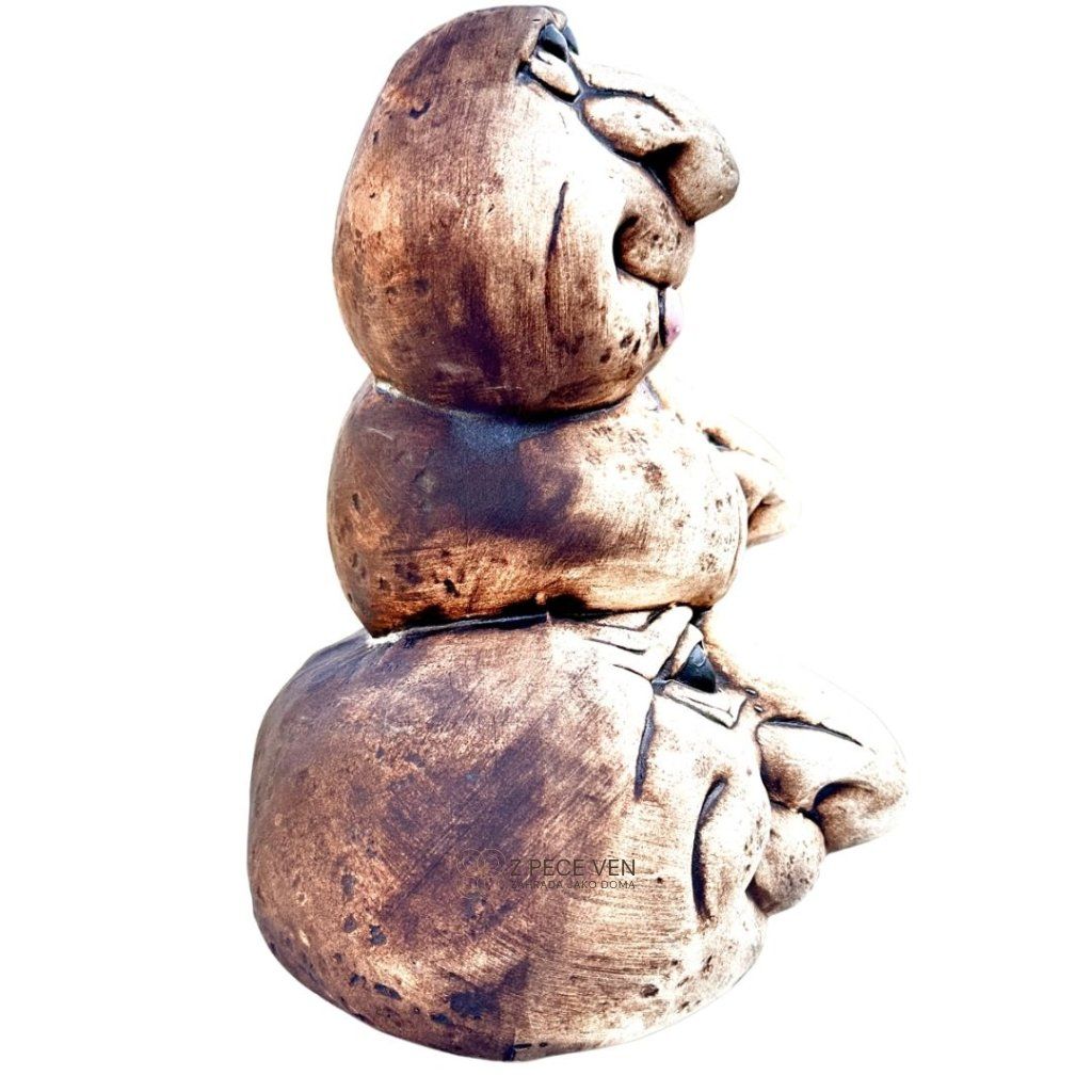 Soška může zůstat venku po celý rok. Důležité je zajistit, aby pod ní nebo v případných dutinách nezůstala stát voda, která by při zamrzání mohla keramiku poškodit.