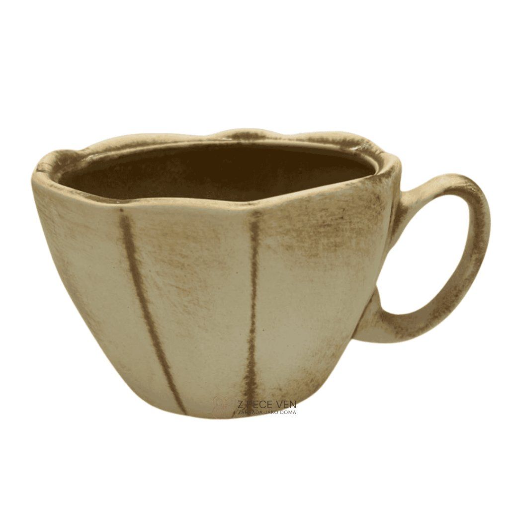 Keramický květináč ve tvaru hrnku zaujme originálním designem inspirovaným klasickým nádobím. Díky jemnému rýhování, výraznému uchu a ruční patině přirozeně doplní vaši zahradní expozici i stylové dekorace v interiéru. Je to ideální kousek pro ty, kteří hledají spojení tradice a hravého detailu.