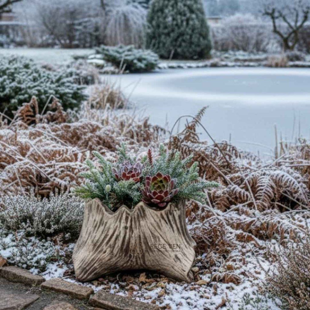 Pařez je plně mrazuvzdorný a může zůstat venku po celý rok. Důležité je pouze zajistit, aby v něm nezůstávala stát souvislá hladina vody, která by mohla při zamrznutí namáhat stěny. Pro maximální životnost v extrémních mrazech doporučujeme květináč umístit pod stříšku.