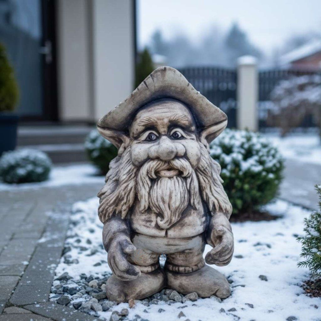 Trpaslík bez potíží zvládne sníh i ranní mrazíky. Je však důležité zajistit, aby nestál v kaluži vody, která by mohla zamrznout. Pro maximální životnost v extrémních podmínkách doporučujeme dekoraci přesunout na chráněné místo.