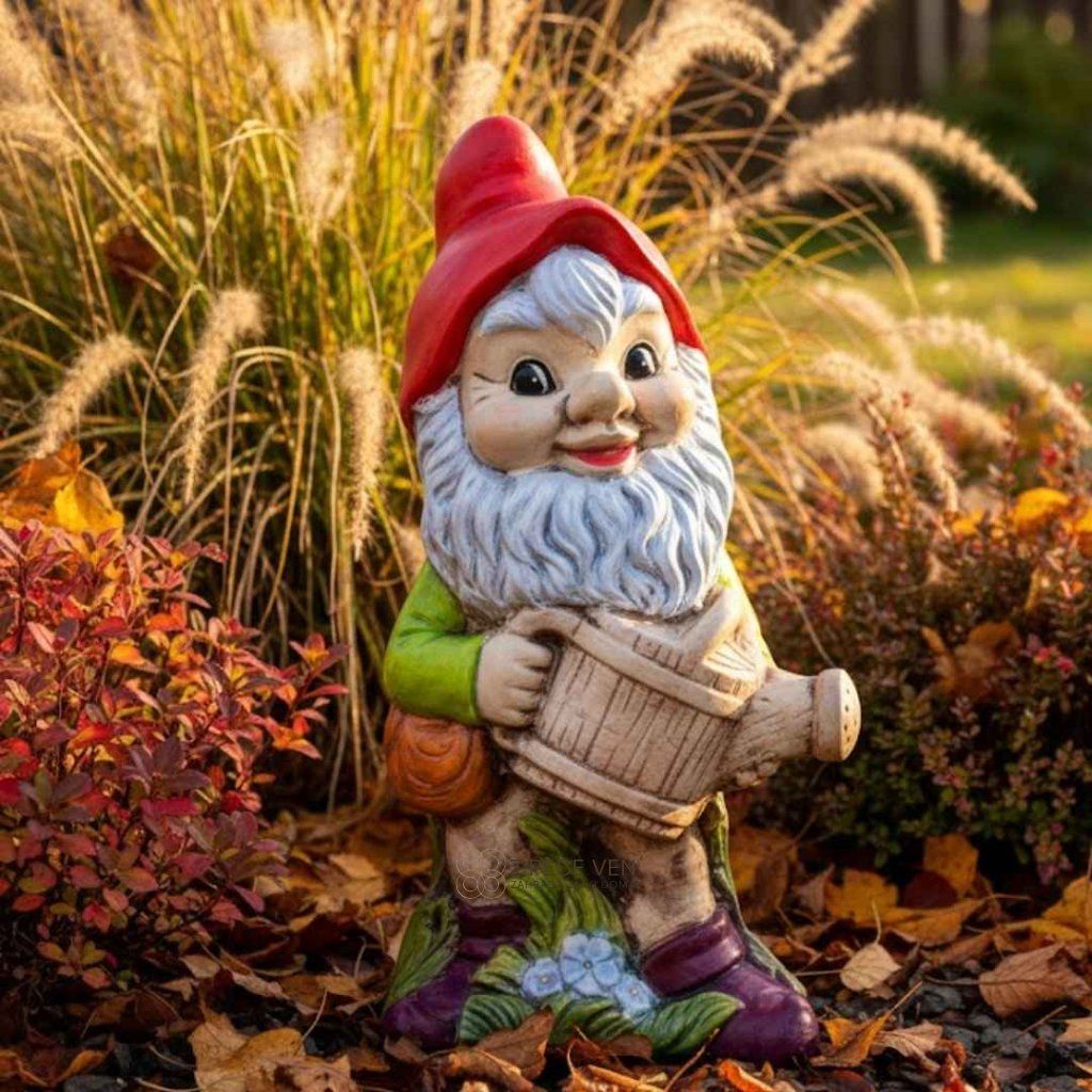 Keramický trpaslík vyšší postavy funguje jako jasný orientační bod u vstupu nebo podél cesty.