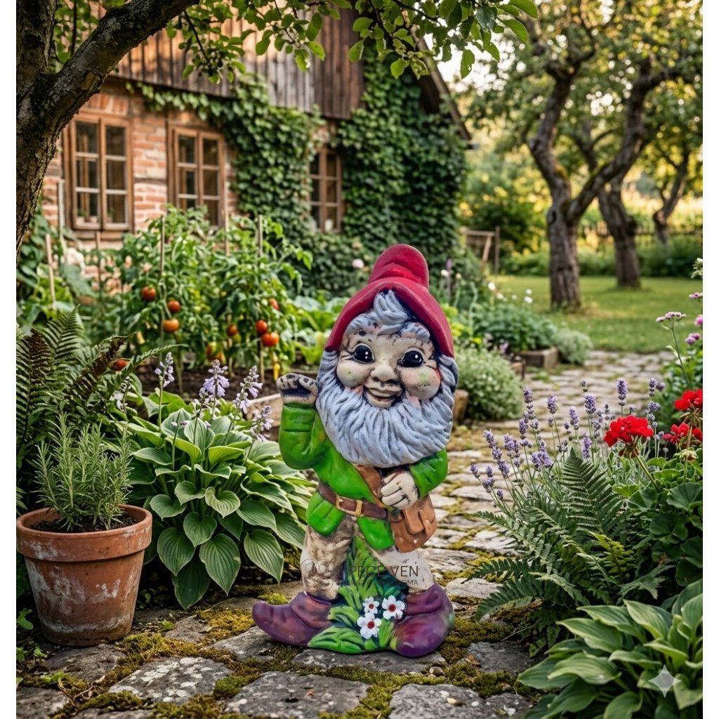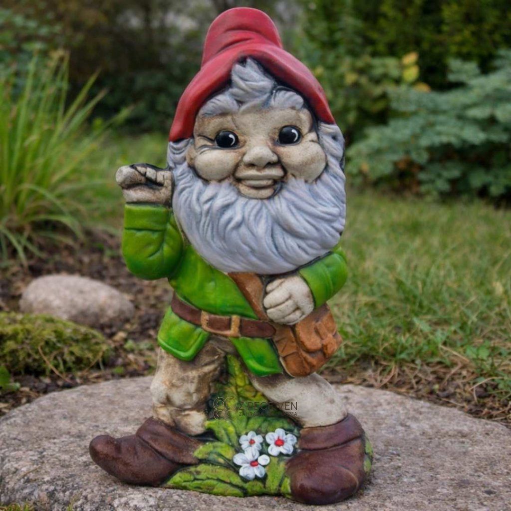 Keramický trpaslík ve výšce 46 cm stojí jako hlavní bod prostoru – nepřehlédnete ho ani z dálky.