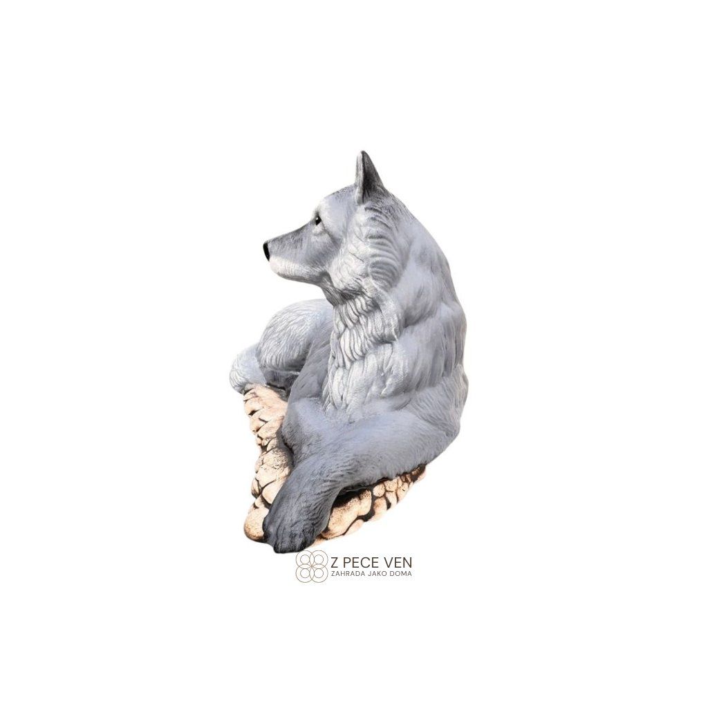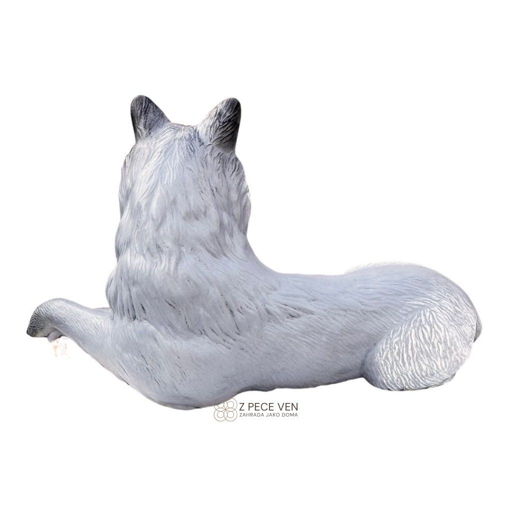 Keramický vlk Tesák leží v prostoru jako klidný, ale nepřehlédnutelný prvek.