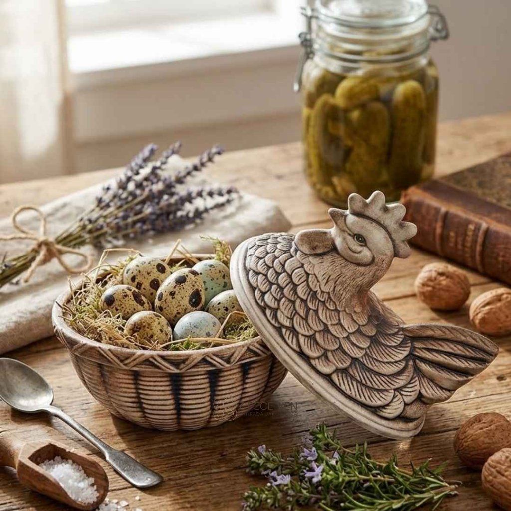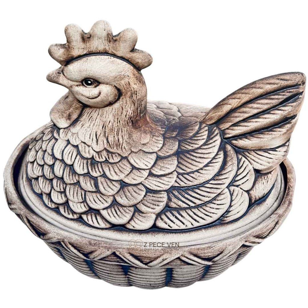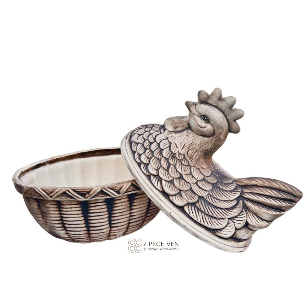 Keramická dóza ve tvaru slepice spojí úložný prostor s dekorací a funguje i jako netradiční květináč.