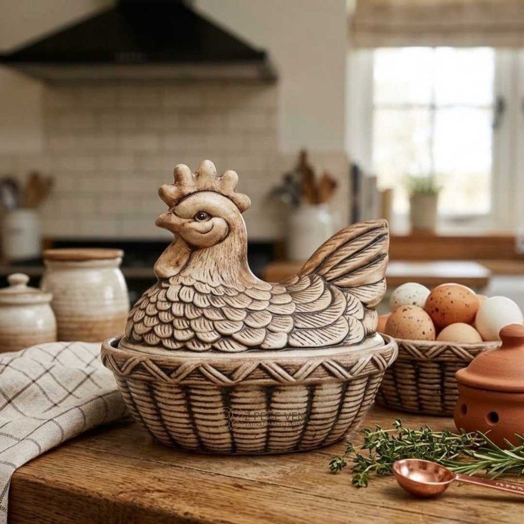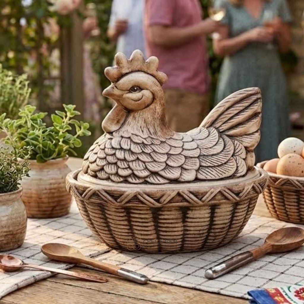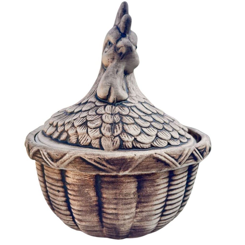 Keramická dóza ve tvaru slepice spojí úložný prostor s dekorací a funguje i jako netradiční květináč.